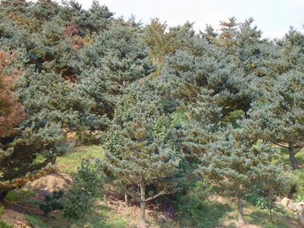 華南五針松屬松科松屬五針松組,是松科中最原始、最古老的一族,為我國特有樹種,1999年被確定為國家Ⅱ級重點保護野生植物,主要分布在廣東、廣西、湖南、貴州海拔700米—1600米的亞熱帶山地。到了冬天,為了適應懸崖峭壁的嚴酷環境,華南五針松會分泌出一種白色防寒物質,成為與眾不同的“藍松”,有時甚至呈現出光彩奪目的粉藍色。